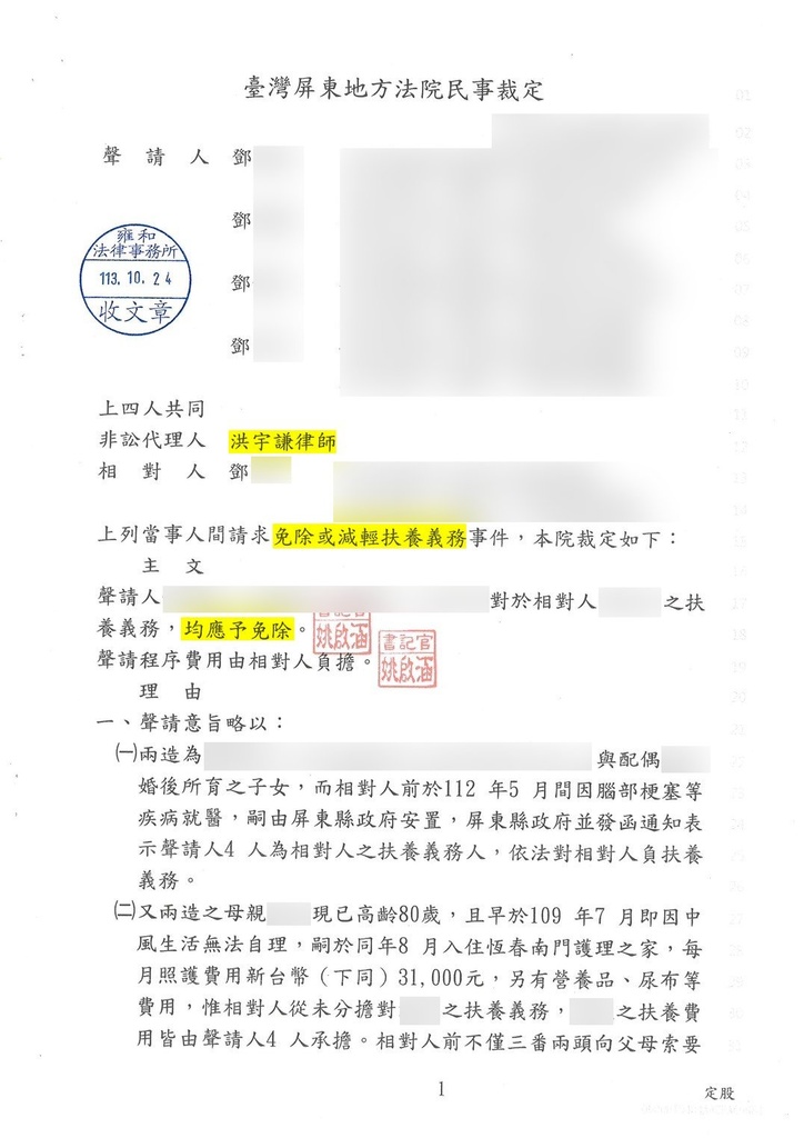 經由法院審理,法官認可洪律師提出的證據,確認四姊妹長期照護母親已盡全力,且經濟能力確實無法再承擔額外的兄弟扶養費,成功免除四姊妹對小昇的扶養義務。