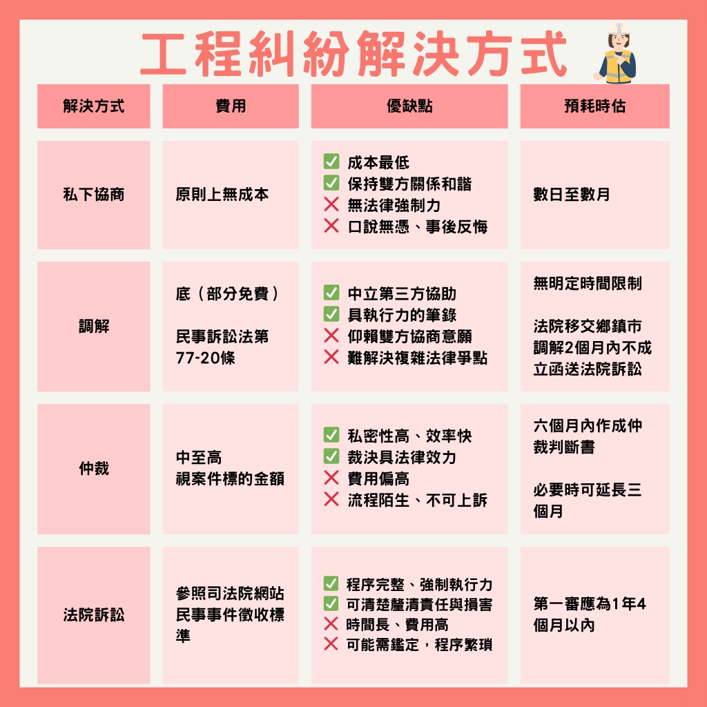 當工程糾紛發生後,當事人通常會面臨是否要走法律途徑,或先行協商解決的抉擇。根據案件複雜程度與金額大小,以下四種常見方式可作為工程糾紛解決的參考方向。